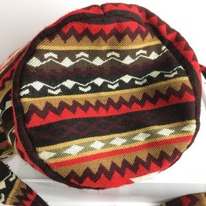Ecuador drawstring bag with tassel ties. Adjustable length (wooden ring is used to tie strap to desired length.). Lined interior with zipper pocket. Fun for a day at the beach or city. See photos for measurements.