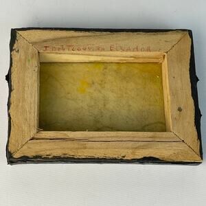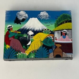 Ecuador Mini Animal Hide Painting Folk Art Volcano Animals People 4 1/2 x 3 3/8