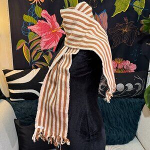 Ecuadorian 100% Wool Fringed Striped Scarf, Natural Cream with Brown Stripes