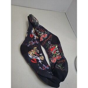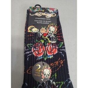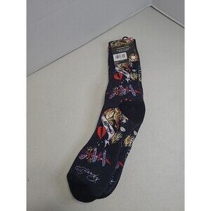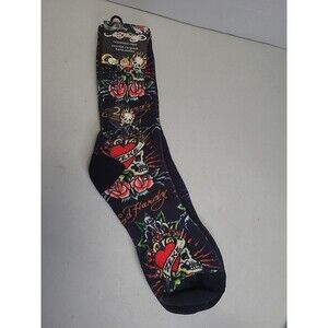 The product is a pair of Ed Hardy crew socks for men in size 6-12. These black socks feature an abstract pattern with a skull, heart, and tiger design, perfect for casual occasions. Made of 98% polyester and 2% spandex, the mid-calf length socks are cushioned for added comfort and are suitable for all seasons. The full toe style and machine washable care make these stylish socks a must-have addition to any wardrobe, especially for anyone who loves the Ed Hardy brand and its unique tattoo-inspired designs. Look closely at the pictures for condition