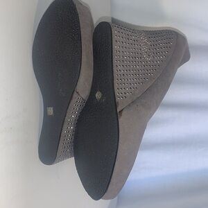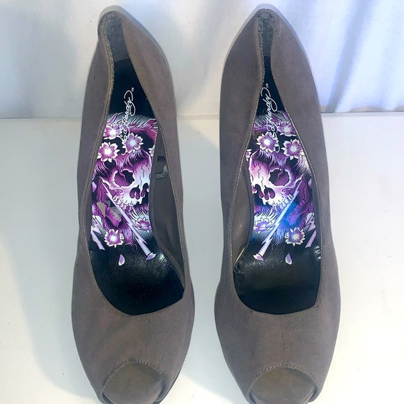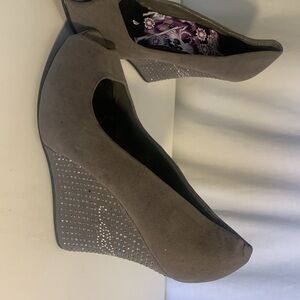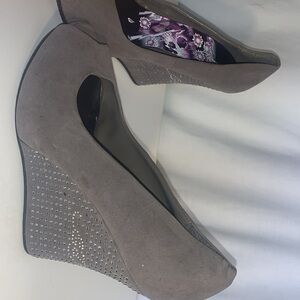 Ed Hardy, size 10 wedge shoe, peep toe, suede-like material. A studded shoe with the name Ed Hardy spelled out in studs.