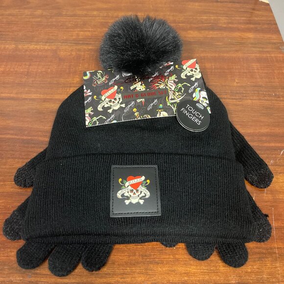 Ed Hardy Beanie and Glove (with Touch Fingers) Set BLACK