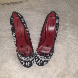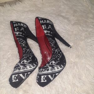 These Ed Hardy heels feature a sleek black base with intricate white embroidery, offering a perfect blend of elegance and edgy style. The pointed toe and stiletto heel add a touch of sophistication, making them a standout choice for any occasion.