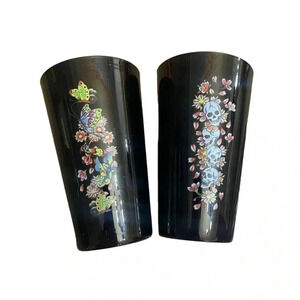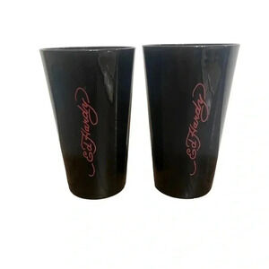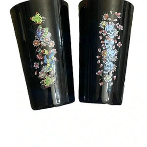 Ed Hardy Black Tall Drinking Glasses 16oz Set of 2 Butterflies and Skulls