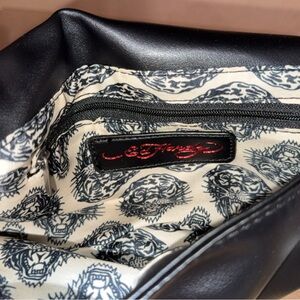 Chic Ed Hardy crossbody with vibrant floral design. Features bold lettering and edgy style.