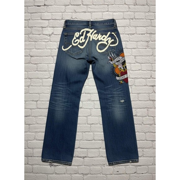 Stand out in these authentic Ed Hardy jeans featuring bold Brave Hearts Stay True eagle embroidery and classic tattoo graphics. Vintage Y2K style with signature detailing, crafted in size 26 for a statement streetwear fit.