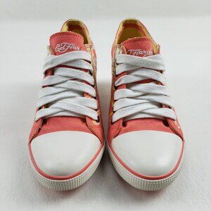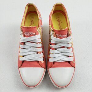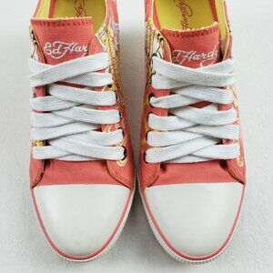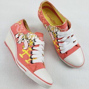 Ed Hardy Bret Wedge Sneaker Womens 7 Orange Canvas Graphic Lace Up Chunky Y2K