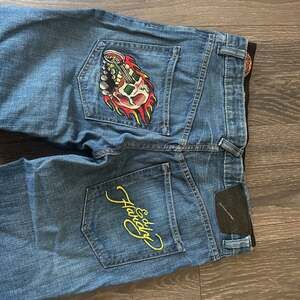 These Ed Hardy by Christian Audigier Y2K denim jeans feature signature graphic embroidery on the front pocket and back pockets, showcasing the brand's iconic tattoo-inspired aesthetic. The light wash denim provides a vintage feel, while the exposed Ed Hardy branded waistband adds a unique touch. Made from 100% cotton, these jeans offer comfort and a classic straight-leg fit. Perfect for Y2K fashion enthusiasts or those looking for a statement denim piece.