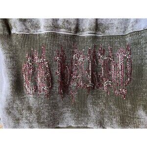 Ed Hardy Christian Audgier women's Vintage Faded Ombre Olive Green Sparkly Rose & Skull Rhinestones Lightweight Silk Cotton Knit Pullover Hooded Hoodie Sweater, size Small, deep V-neck, front pouch pocket, red & white rhinestone rose on front left chest and red & white rhinestone Ed Hardy logo on front hemline, red & white rhinestone Ed Hardy logo across back shoulders and red & white rhinestone skull on mid-back, long Raglan sleeve with muted pink stripe accent at cuffs, slim fit tunic style.