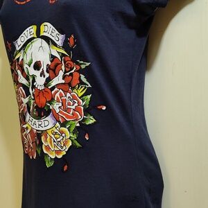 Ed Hardy Dark Blue Skull and Roses Tee Love Dies Hard Rhinestone Logo Name Size