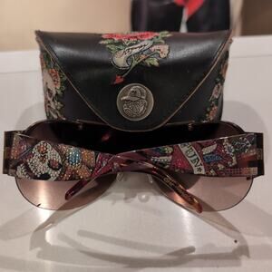 Ed Hardy EHS003 Cocoa 125 Rimless Sunglasses Case Vintage Y2K Skull Swarovski