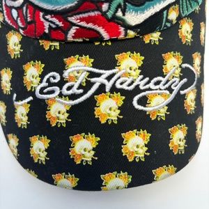Item Description: This deluxe cap features a bold embroidered skull surrounded by vibrant red roses and the iconic Ed Hardy logo amidst a field of golden sunflowers.