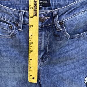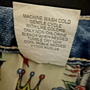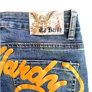 Retro Y2k Tattoo Streetwear Fashion. Ed Hardy Embroidered True Love Slim Fit & Flare Leg Jeans in Blue Medium Light Wash. 5 Pocket Denim with Big "ED HARDY" Spellout and Eternal Love Heart/Rose Graphic across the Back and Pockets. Cotton/Poly/Spandex Blend for Stretch comfort and fit. Great Tattoo inspired inside pockets graphics!