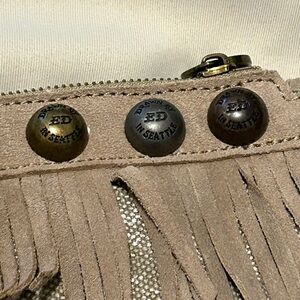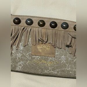 Excellent condition ed hardy clutch wristlet bag. Super cute with suede fringe and ed hardy buttons.