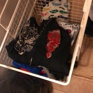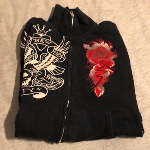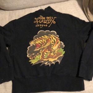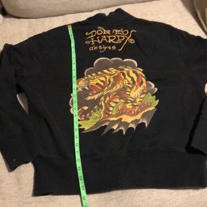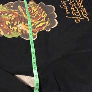 Ed Hardy oversized zip up . Cow neck, 2 front kangaroo pockets. Red velour symbol on left side. Traditional eagle , crown on right. Colorful tiger on the back. VGUC, no trouble spots I can see