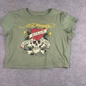 Ed Hardy short sleeve tee with skull and heart graphic. Features 'Love Kills Slowly' banner. Bold and stylish design.