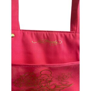 Ed Hardy Hot Pink Tote Bag With Gold Skull Print & Clear PVC Pocket