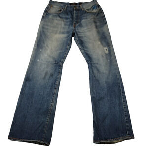 Pre-owned, good vintage condition. Shows fading, frayed hem, and intentional distressing. Adds to the rugged character of the jeans. See photos for details.