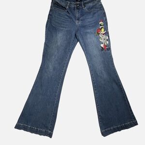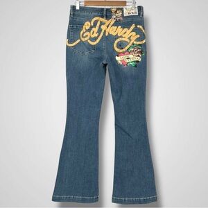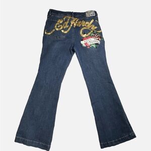 Ed Hardy Fit & Flare jeans featuring iconic tattoo-inspired artwork. Front leg features a dagger with rose design and 'Love Eternal' text. Back showcases large Ed Hardy signature logo in gold embroidery with additional tattoo art motifs. Medium wash denim with slight fading. Classic 5-pocket styling. Flared leg silhouette. Excellent condition with vibrant embroidery and graphics intact. Material composition: 70% Cotton, 22% Polyester, 7% Rayon, 1% Spandex for comfortable stretch.