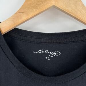 Features: Cropped length, Short sleeves, Front and back Ed Hardy logo graphics, Y2K tattoo art style, Soft, broken-in feel