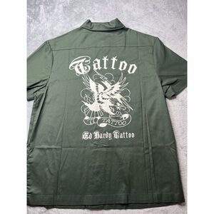 Ed Hardy Men's Button Short Sleeve Army Green Shirt Tiger Eagle Tattoo NWT