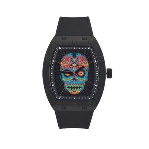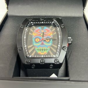 Here is a Ed Hardy men’s skull print dial Matte Black silicone strap analog watch new