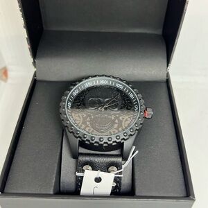 Here is a Ed Hardy men’s skull print dial Matte Black silicone strap analog watch new