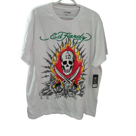 Ed Hardy Men’s XL Skull 13 “Free Forever” White Tee Y2K NWT