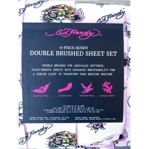 Ed Hardy 6-piece Queen Sheet Set in a vibrant pink tattoo-inspired design. Features bold tigers, hearts, roses, skulls, swallows, and classic Ed Hardy artwork.