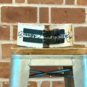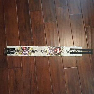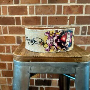 This is a rare and unique find Ed Hardy belt. A neat, genuine leather high waist belt. With the traditional Ed Hardy "Love Kills Slowly" quote wrapping around neat skulls and hearts. This belt is lined around outside with a tiny strip of ruffles on the top and bottom for a cute, dainty look. The design and colors really pop in real life. πβ€ππ