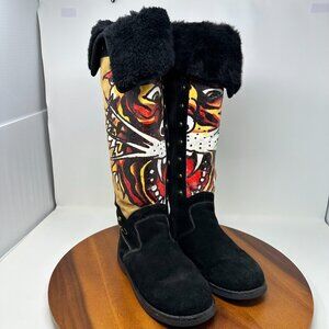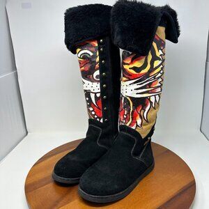 Ed Hardy Tall Faux Fur Boots Size 6 Black Tiger Painted Suede Studded