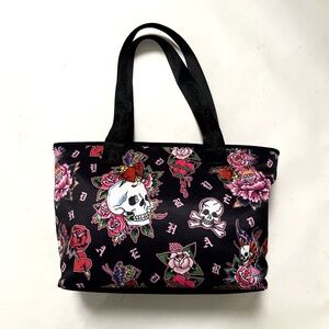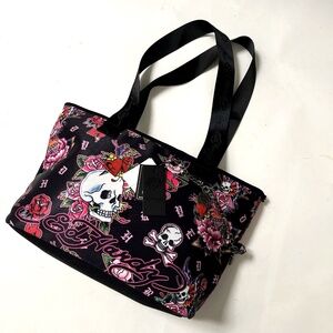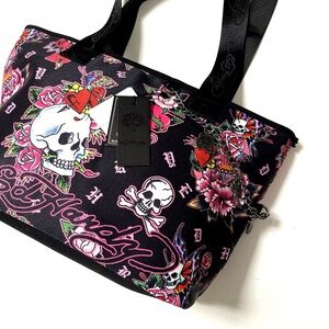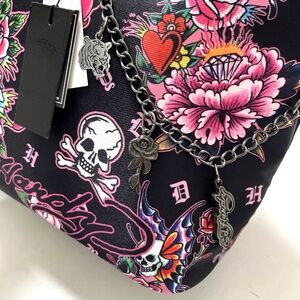 Ed Hardy Tattoo Print Tote Bag with Charms Logo Rose Tiger Black Nylon NWT