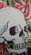 Ed Hardy handbag featuring a bold skull and roses design. Black with red, white, and green accents.