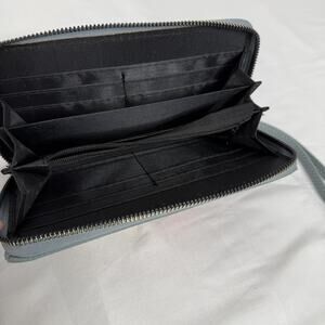 Interior features card slots, multiple bill compartments, and a zippered coin pocket