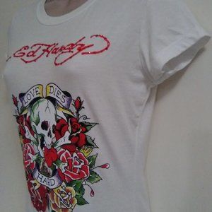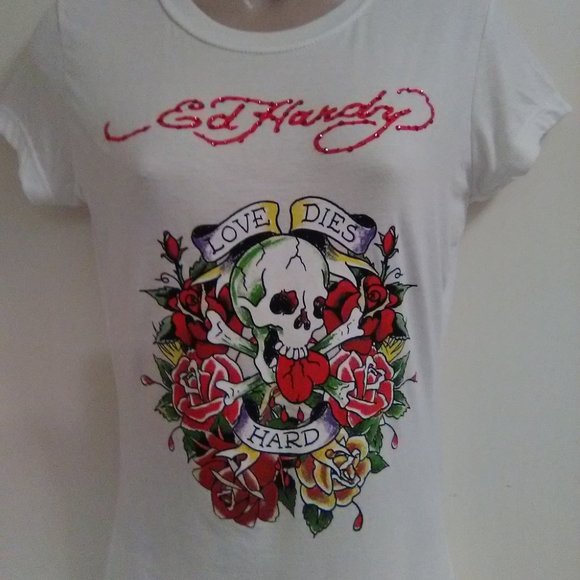 NWOT Ed Hardy White Short Sleeve with Rhinestones "Love Dies Hard" T-shirt Size Medium. Like new, never worn. It has rhinestones on the name only. All reasonable offers are considered, NO LOW BALLING PLEASE. Any questions, please contact me, thank you for stopping by.