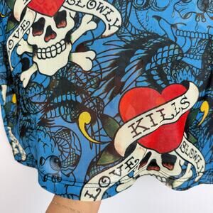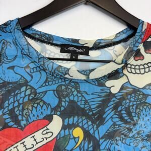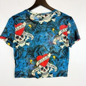 Ed Hardy Womens Mesh Layered LKS Skull Tattoo Cropped Baby Tee Blue - L
