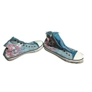 Vintage Ed Hardy high-top sneakers in women’s size 9 with a distressed denim upper and tattoo-inspired skull and floral graphics. These bold sneakers feature Ed Hardy’s signature printed tongue and side art, combining streetwear edge with collectible style.