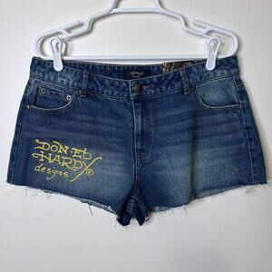 Ed Hardy Y2K Jean Shorts Large Blue Cut-Off "Dual Tigers" Print Denim NWT