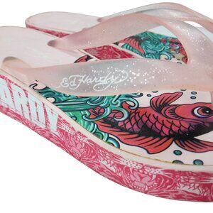 Ed Hardy Y2K Vintage Wedge Flip Flop Koi Fish Sandals Size 6 Pink Graphic Foam