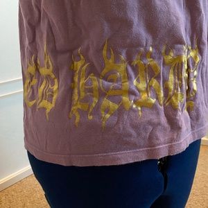 Lavender T-shirt with Ed Hardy’s name in gold foils, and in bling within a big flower. Ed Hardy’s name is also in gold foil letters at the bottom of the back of the shirt.