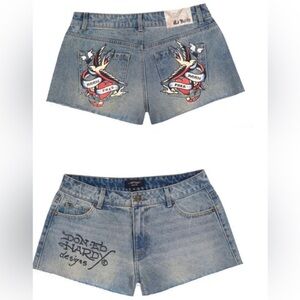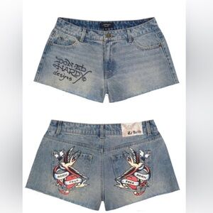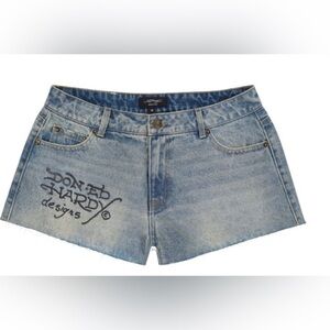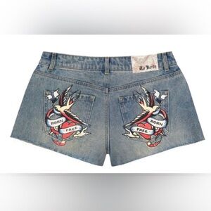Vintage inspired shorts in a light tint denim. Complete with raw cut hems, archival Ed Hardy swallow graphics and a signature logo in gold.