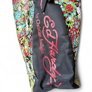 Make a statement with this iconic Christian Audigier x Ed Hardy tote featuring edgy Geisha & Skull graphics, silver hardware, and signature tattoo-inspired flair. This multicolored vinyl tote brings serious Y2K vibes with a touch of glam.