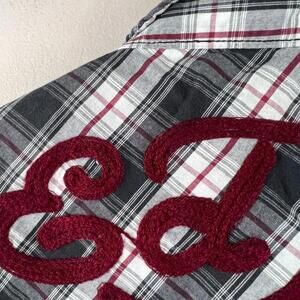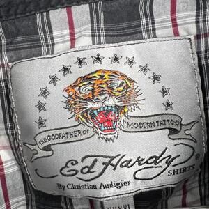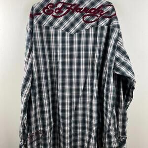 Authentic Ed Hardy by Christian Audigier long sleeve western-style shirt. Features bold plaid pattern in black, gray, and red with large embroidered Ed Hardy script on the back and front pockets. Iconic tiger patch inside collar. Double chest pockets, pearl snap buttons, and contrast stitching details.