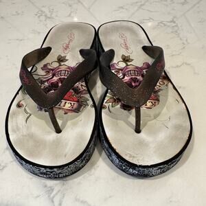 Ed Hardy flip-flops signature tattoo-graphics platform wedge size 10 Y2K baddie
