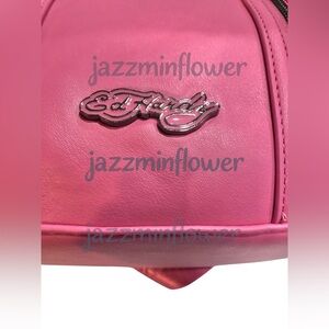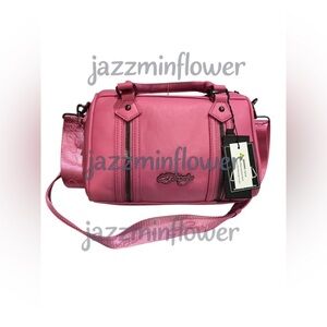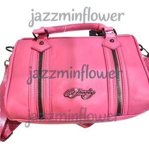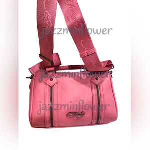 Ed Hardy pink top handle crossbody satchel bag with iconic Ed Harley logo woven strap