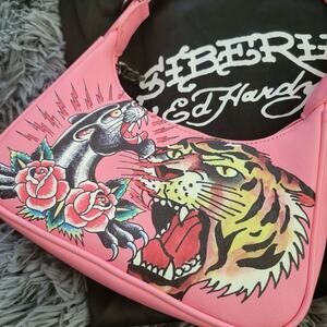 Ed Hardy by Siberia Hills Pink Small Hobo Purse with Tattoo Tiger and Panther Print. Comes with Dustbag.