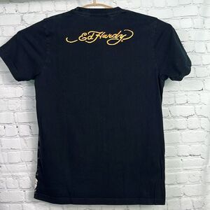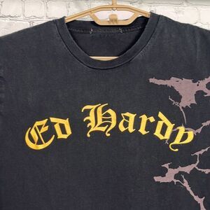 Black tee featuring skulls and floral graphics. Bold yellow Ed Hardy logo.
