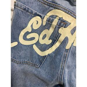 Ed Hardy in a "Retro Light" blue denim, the Dagger Heart jeans arrive with luxury embroidered graphics and a flared silhouette for a fun Y2K vibe. Showcasing tattoo-style artwork of a knife stabbing through a Heart near the bottom hem of the left leg, the bootcut jeans lend streetwear accents with additional printed branding across the back pockets. Adorned with an adjustable waistline sizing strap on the back for a secure fit, the designer denim is finished with a standard five-pocket configuration, embossed hardware, and a classic zip closure on the button fly.