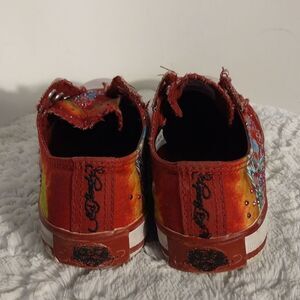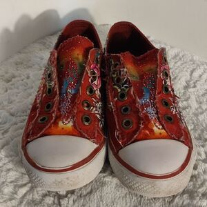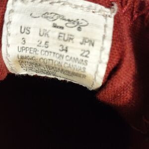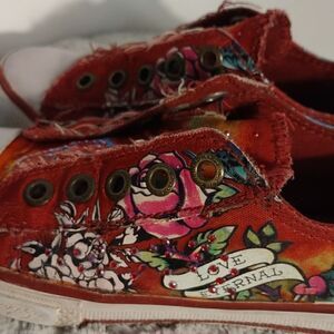These red sequined Ed Hardy laceless sneakers are a girl's size 3. Cushioned insoles for comfort. Pre-owned and in great condition. All offers are welcome.