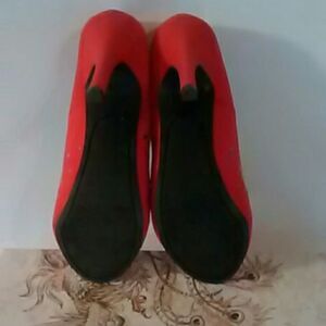Haute Heels. Tomato red canvas upper. Signature embroidered on heel. Blond girl with roses. Platform inside. Size 6 has 4.5 heels over.5 platform. Worn once just so pretty heels would show, so they are like new. Edgy and fabulous.